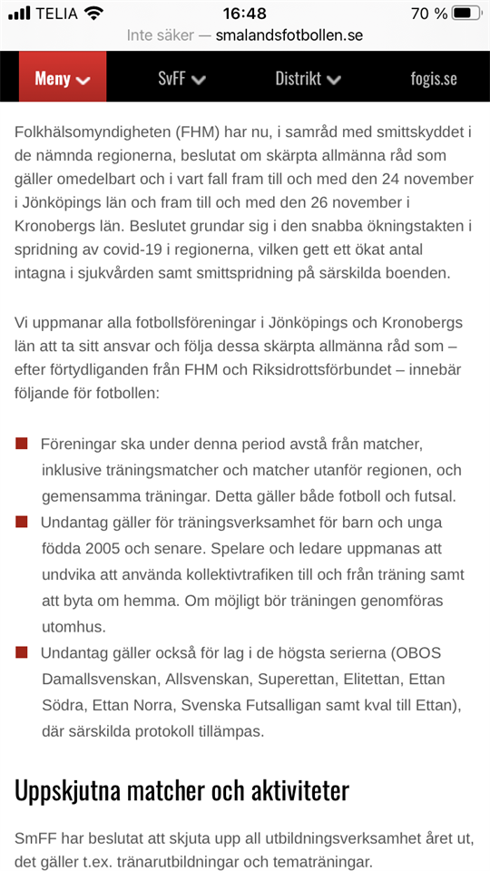 I och med de nya riktlinjerna pga Covid-19 för Kronobergs Län ställs kommande träningar och provträningar in för damlaget fram till och med 26/11, därefter får vi se vad det fattas för nya beslut. Tråkigt men just nu är det viktiga att få bukt med situationen. Lagans AIK 6 nov 2020 0kommentarer