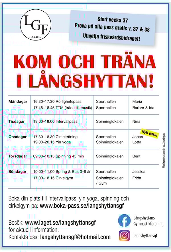 För Intervallpass, yin yoga, spinning och cirkelgym behöver du boka din plats. Det gör du via länken: