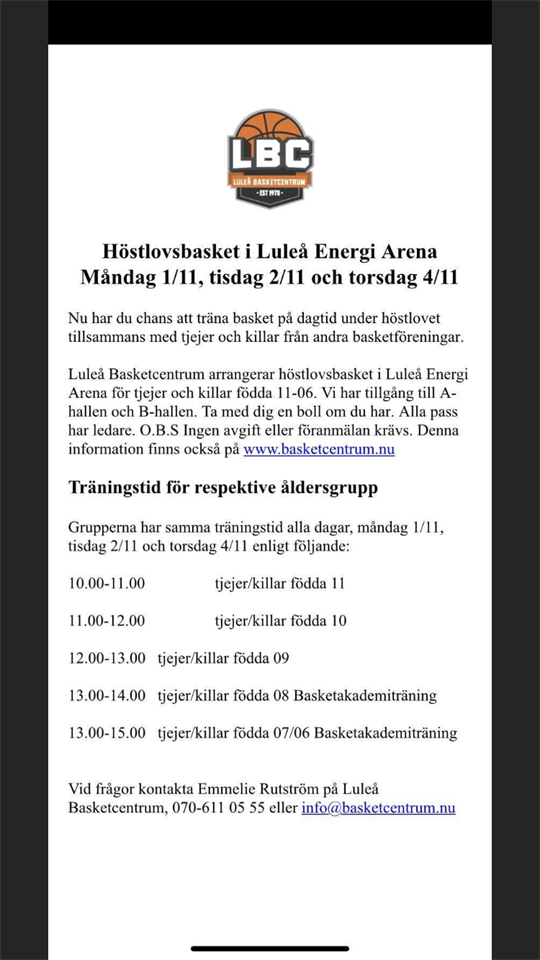 Måndag den 15 nov är det öppen provträning och information om NIU(se länk). Kl 16 - 18.30 i Kronanhallen. Alla som är det minsta intresserade rekommenderas att gå på den träningen för att få info mm. https://www.lulea.se/utbildning--forskola/gymnasieskola/lulea-gymnasieskola/mer-om-vara-utbildningar/idrottsutbildning.html