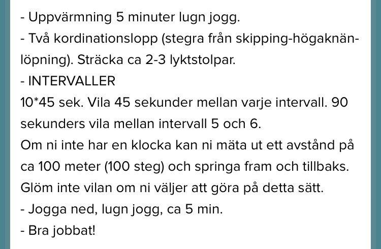 Idag ska ni springa korta intervaller. Tempot ska vara så högt att det blir jobbigt mot slutet av varje intervall men inte högre än att ni orkar springa nästa intervall i ungefär samma tempo. - Uppvärmning 5 minuter lugn jogg. - Två kordinationslopp (stegra från skipping-högaknän-löpning). Sträcka ca 2-3 lyktstolpar. - INTERVALLER 10*45 sek. Vila 45 sekunder mellan varje intervall. 90 sekunders vila mellan intervall 5 och 6. Om ni inte har en klocka kan ni mäta ut ett avstånd på ca 100 meter (100 steg) och springa fram och tillbaks. Glöm inte vilan om ni väljer att göra på detta sätt. - Jogga ned, lugn jogg, ca 5 min. - Bra jobbat! F06 16 aug 2020 2kommentarer