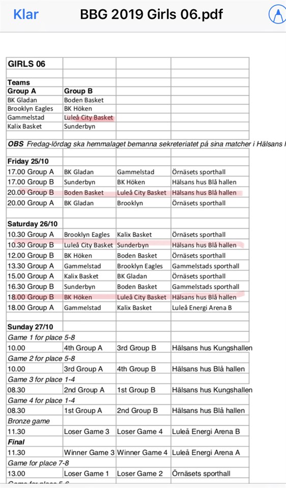 I helgen som kommer ska vi spela cup, Barents basketball games. Vi fick tyvärr inte anmäla två lag så det blir att samsas om speltiden. Vi kommer att kalla 10 spelare till varje match. Info om vilka matcher som respektive spelare ska spela kommer. Bifogar spelschema. Meddela om er tjej INTE kan delta och vilka matcher det i så fall gäller.