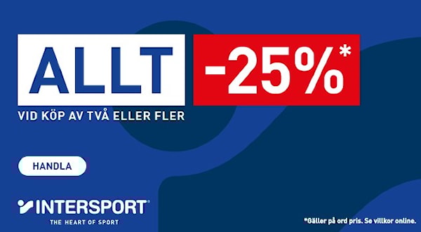 Mellan den 23/4 - 30/4 har vår samarbetspartner Intersport 25% rabatt på allt, för dig som handlar två varor eller fler, i butik eller på interport.se. Ett perfekt läge att köpa det ni behöver för vårens alla aktiva dagar.
