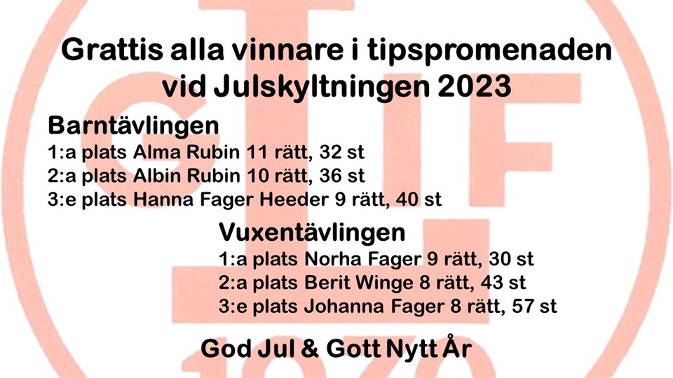Barnfrågorna 1) Hur många kort finns det i en kortlek om man inte räknar med jokrarna? Rätt svar: 1, 52 st 2) Vad heter Skorpans storebror i Bröderna Lejonhjärta? Rätt svar: X, Jonatan Lejon 3) Vad kallas bakändan på en båt? Rätt svar: X, Aktern 4) Vad heter det högsta berget på jorden? Rätt svar: 1, Mount Everest 5) Vad heter den stora klockan som finns i London? Rätt svar: X, Big Ben 6) Vad heter de djuren som bor i havet och bildar rev? Rätt svar: X, Koraller 7) Vem är inte en dvärg i Snövit och de 7 dvärgarna? Rätt svar: 2, Hater 8) Vad har råttan i sin ficka? Rätt svar: X, 4 hål 9) Hur många olika blommor ska man plocka och ha under kudden på midsommarnatten? Rätt svar: 2, 7 st 10) Vad använder man vanligast som näsa på snögubben? Rätt svar: 2, Morot 11) Vad kallas personen som läser upp vädret på tv? Rätt svar: 2, Meterolog Vuxenfrågorna 1) Hur lång är en tum? Rätt svar: 1, 2.54 cm 2) Vilka länder har vunnit flest EM-guld i fotboll? Rätt svar: 2, Spanien och Tyskland 3)Hur många länder finns det i världen? Rätt svar: 1, 195 st 4) Vilket år kom den första Iphone ut? Rätt svar: 2, 2007 5) Vilken var den mest spelade låten på spotify i Sverige 2020? Rätt svar: X, Svag med Viktor Leksell 6) När förklarade WHO att utbrottet av Covid-19 utgjorde en pandemi? Rätt svar: X, 11 mars 2020 7) Vilket år installerades Vladimir Putin som president i Ryssland? Rätt svar: 1, År 2000 8) Vilket år sjönk skeppet Vasa? Rätt svar: 2,1628 9) När öppnades Halmstad-Bolmens järnväg? Och när lades den ned? Rätt svar: 1, 1889 - 1966 10) När upphörde Lidhult som landskommun? Rätt svar: 1, den 31/12 1970 11) Vad heter Nobelpristagaren i litteratur 2023? Rätt svar: 2, Jon Fosse Skiljefrågan: Hur många kulor fanns det i plastburken? 38 stycken Ett stort Tack till Lidhults Bygg & Lantmän och ICA Nära Lidhult för sponsringen av priserna. God Jul & Gott Nytt År önskar Lidhults GoIF!