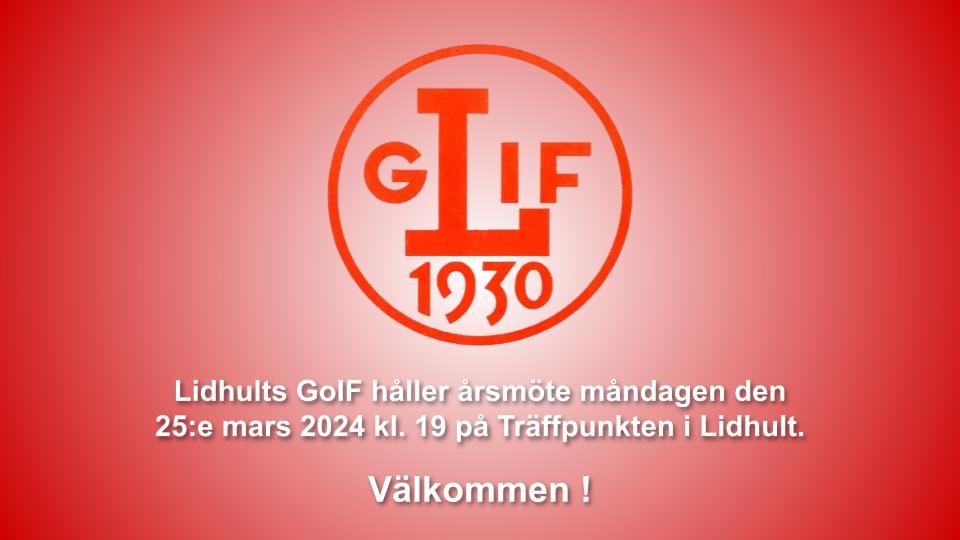 Sedvanliga årsmötesförhandlingar samt därpå följande smörgåstårta som föreningen bjuder på. Mötet kommer behandla styrelsens förslag till uppdaterad Föreningspolicy. Årsmöteshandlingar kommer finnas tillgängliga på LGoIFs hemsida senast en vecka innan mötet, https://www.laget.se/LGoIF/Document. Alla medlemmar Välkomna! Styrelsen för Lidhults GoIF
