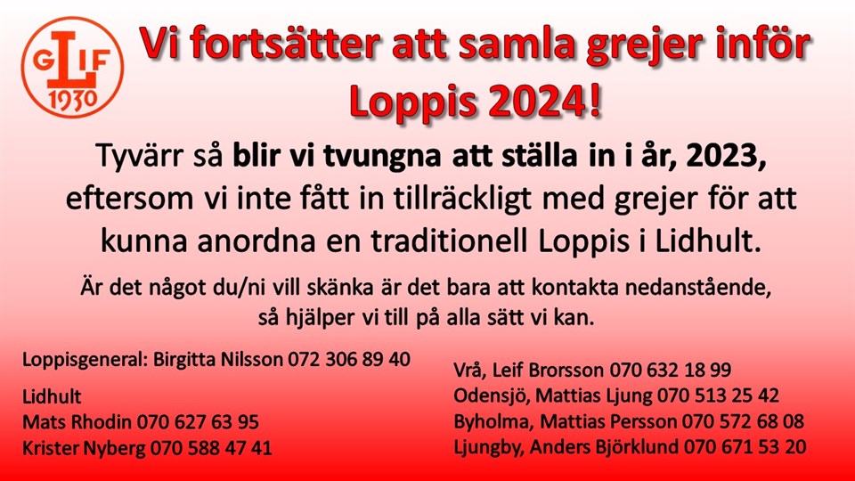 Varje år, förutom under pandemiåren , har vi kunnat anordna vår populära loppmarknad. I år har vi tyvärr inte fått in tillräckligt med grejer vilket gör att vi blir tvungna att ställa in i år 2023. Släng inte dina grejer du inte har användning för längre utan skänk dem till oss. Vi tar gärna emot dem inför 2024 och hjälper er på bästa sätt. Vi ber er tänka på vår ort, vår förening och våra ungdomar och alla andra som föreningen betyder så mycket för. Alla pengar vi får in från loppmarknaden går till just detta och inget annat. Är det något du/ni vill skänka är det bara att kontakta någon på listan, så kommer vi överens om när och var ni kan lämna eller när vi ska hämta. //Styrelsen för Lidhults GoIF