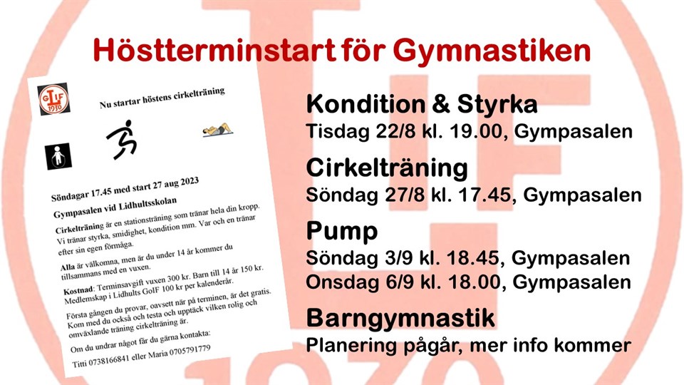 Nu är det dags att börja röra på sig igen efter sommaren :-) Kondition & Styrka Tisdag 22/8 kl. 19.00, Gympasalen Cirkelträning Söndag 27/8 kl. 17.45, Gympasalen Pump Söndag 3/9 kl. 18.45, Gympasalen Onsdag 6/9 kl. 18.00, Gympasalen Kontakta ledarna för platsbokning Barngymnastik Planering pågår, mer info kommer Mer info på denna sida (klicka på texten)