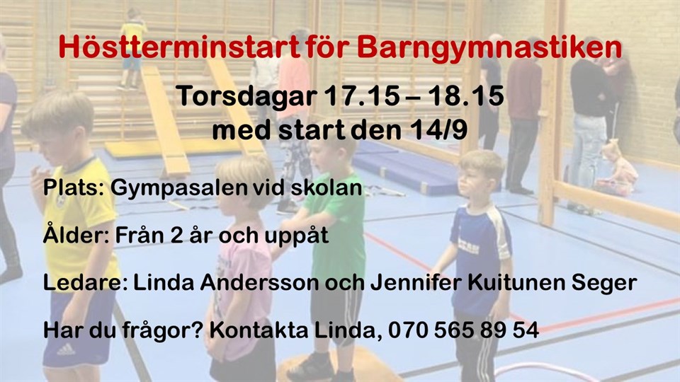 Nu är planeringen för barngymnastiken klar. Vi börjar den 14/9 kl. 17.15 i Gympasalen vid skolan. Nya ledare är Linda Andersson och Jennifer Kuitunen Seger. Alla barn med föräldrar hjärtligt välkomna! Mer info om gymnastiken på denna sida (klicka på texten)
