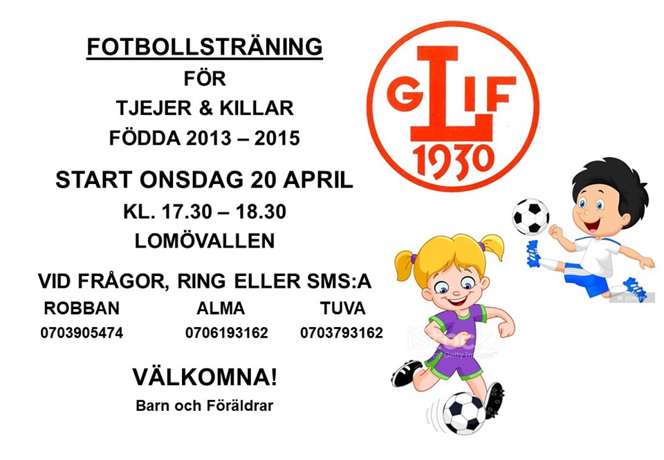 Nu kan vi äntligen starta upp ett nytt ungdomslag för tjejer och killar födda 2013-2015 När: Onsdag den 20 april, kl. 17.30 – 18.30 Var: Lomövallen Vid frågor, ring eller sms:a Robban: 0703905474 Alma: 0706193162 Tuva: 0703793162 VÄLKOMNA! Alla barn och föräldrar