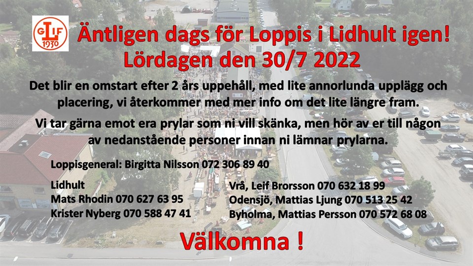 Lördagen den 30/7 2022 Det blir en omstart efter 2 års uppehåll, med lite annorlunda upplägg och placering, vi återkommer med mer info om det lite längre fram. Vi tar gärna emot era prylar som ni vill skänka, men hör av er till någon av nedanstående personer innan ni lämnar prylarna. Loppisgeneral: Birgitta Nilsson 072 306 89 40 Lidhult, Mats Rhodin 070 627 63 95, Krister Nyberg 070 588 47 41 Vrå, Leif Brorsson 070 632 18 99 Odensjö, Mattias Ljung 070 513 25 42 Byholma, Mattias Persson 070 572 68 08