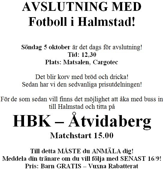 AVSLUTNING MED Fotboll i Halmstad! Söndag 5 oktober är det dags för avslutning! Tid: 12,30 Plats: Matsalen, Cargotec Det blir korv med bröd och dricka! Sedan har vi den sedvanliga prisutdelningen! För de som sedan vill finns det möjlighet att åka med buss in till Halmstad och titta på HBK – Åtvidaberg Matchstart 15.00 Till detta MÅSTE du ANMÄLA dig! Meddela din tränare om du vill följa med SENAST 16/9! Pris: Barn GRATIS – Vuxna Rabatterat Vill du inte följa med till Halmstad så kommer det att finnas tillgång till simhallen eller idrottshallen. Detta beror på om simhallen har öppnat tills dess! VÄLKOMNA! Ungdomsledarna PF-0708 3 sep 2014 0kommentarer