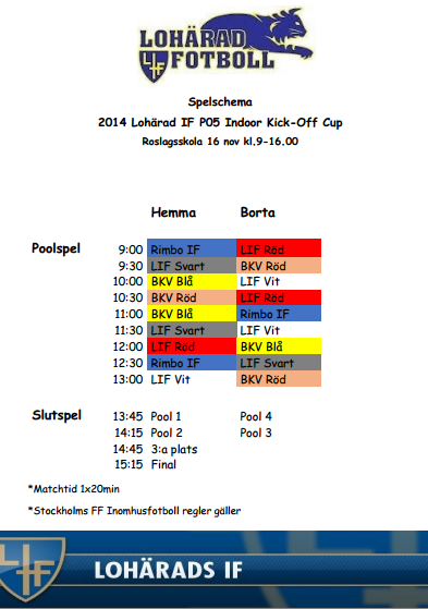 Hej! Söndagen den 16 november kommer LIF P05 att vara värd för en "Indoor Kick Off Cup" på Roslagsskola. LIF kommer att spela med 3 lag, BKV 2 lag och Rimbo IF 1 lag. Den första matchen börjar kl 09:00 och finalen börjar kl 15:00. Alla lag kommer att spela 3 matcher, 1 x 25 min, med topp 4 lag kommer att spela i ett slutspel. Alla spelare är välkomna. Kontakta mig om du inte kan spela. Pia och Helena kommer att ordna kiosken. Prata med dem om du vill hjälpa till. Vi kommer att träffas på Roslagsskola kl 8:00. Lohärad IF Svart - Diego Elian Jonathan Axel Leo B Alvin Markko Arvid Lohärad IF Röd - Josip/Edin Filip Leo L Vincent Felix Marvin Gustav Emil Elias Lohärad IF Vit - Daniel/Ernesto Lucas Teo Antonio Kenan Eddie Joel Oscar P05 28 okt 2014 0kommentarer