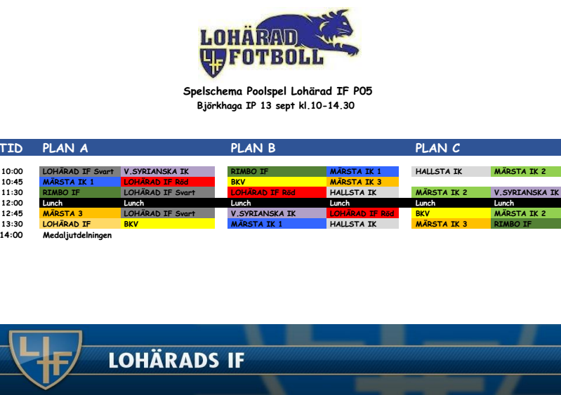 Hello Everyone! På grund av den inställd Poolspel på lördag i Märsta, kommer vi att har en Vänskapsmatch Dagen med Rimbo IF P05 och Hallsta IK P05 på Vargheden. Vi tycker att det skulle bara bra med två lag. Alla spelare är välkomna! Båda lag spelar 3 matcher, 2 x 15min mellan kl. 10 och 12. Vi träffas på Vargheden kl 9:30. Kom klädd i din matchkläder! Återkom om du inte kan spela. Match Tid 1 10.00 Plan A Lohärads IF Svart – Hallsta IK Plan B Lohärads IF Röd – Rimbo IF 2 10.45 Plan A Rimbo IF – Lohärads IF Svart Plan B Hallsta IK – Lohärads IF Röd 3 11.30 Plan A Lohärads IF Röd – Lohärads IF Svart Plan B Hallsta IK – Rimbo IF LIF Svart Tränarna - Daniel/Josip Lucas Leo L Axel Felix Marvin Antonio Teo Markko Oscar Elias LIF Röd Tränarna - Edin/Ernesto Elian Vincent Kenan Emil Eddie Jonathan Gustav Leo B Arvid Joel