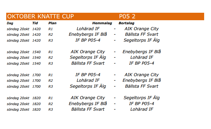 Hej Allihop! Dags för sista utomhus Cup för 2013! 20 oktober spelar vi i Råsunda i Solna. Inomhus cuper kommer snart! Vi kommer att spela två mindre lag för inomhus Cups så alla kan spela. Vi träffas vid Norrbil kl 12:00 och kör tillsammans. Den första matchen är kl 14:20 och den sista är kl 18:20. Vi spelar 4 matcher. PARKERING Antalet parkeringsplatser vid Råsunda IP är begränsade. Alternativa parkeringsplatser finns på Skytteholms IP, utanför Solnahallen, bredvid Statoil eller vid Solna Centrum. Parkering inne på idrottsplatsen är förbjudet. HITTA TILL RÅSUNDA IP Råsunda IP (RIP 1, 2, 3, 4, 5, 6) ligger vid Råsunda Skola. Adress: Ekensbergsvägen 90, Solna Vi rekommenderar att titta på målburarna där planens namn och nummer är angivna. Servering finns i anslutning till sekretariatet på Råsunda IP. Glöm inte benskydd, matchkläderna, fotbollskor, vattenflaska och en riktigt vinnaranda! Knatte Cup Lag 1. Filip 2. Kenan 3. Leo B 4. Eddie 5. Teo 6. Leo L 7. Axel 8. Felix 9. Antonio