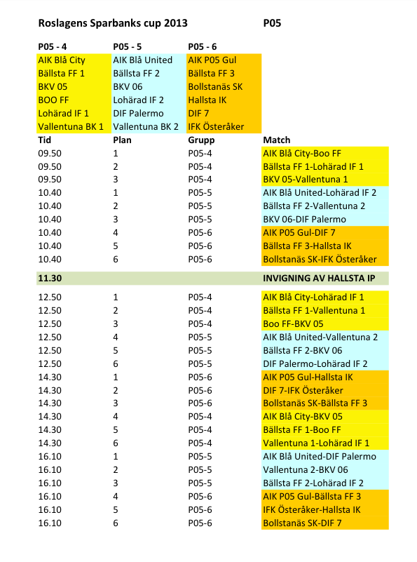 Roslagens Sparbank Cup i Hallstavik Hej allihop! Vi träffas torsdag morgon på COOP parkering kl 08:15 och kör tillsammans. Den första matchen är kl 09:50 och den sista är kl 16:10. Vi spelar med två lag och båda lagen kommer att spelar 3 matcher. Jag hoppas att det nya matchar kläder är klar, men ta med dina gamla matchar kläder. Glöm inte benskydd, matchkläderna (om ni har dem hemma), fotbollskor, vattenflaska, solkräm och en riktigt vinnaranda! Under cupdagen gäller nedsatt entrépris om endast 20kr/spelare till Hallstaviks moderna utomhusbad. Om någon behöver skjuts, maila eller ring mig. //Daniel 0738289489