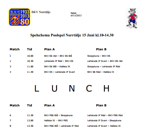 Juni Schema för LEIF P05! Måndag 3 juni - Föräldramöte - Den måndagen 3 juni, kl. 18:00, under vår träning, kommer vi att ha ett föräldramöte för att diskutera sommarens träningar och matcher. Torsdag 6 juni - Hallsta Cup - Hallstavik - två lags (Alla spelare) Lördag 15 juni - Knatteligan Poolspel - två lags (Alla spelare) - Flygfältet -lördag - kl 9:15 Lördag 29 juni - Valloncupen 2013 - Ringvallen, - Ullfors - ett lag (Anmälda spelare-lag beslutas av tränare)