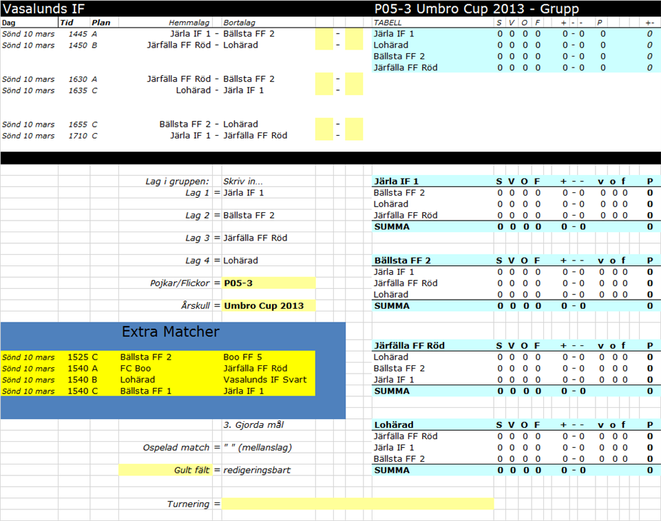 Hej allihop! Nu börjar det dra ihop sig till CUP! Umbro Indoor Cup 2013 - Söndag 10 mars Vi kommer som vanligt att samlas vid Norrbil kl 12:40 för att åka tillsammans. CUP:en äger rum i Kungsängen (ca 1h bilresa från Norrtälje). På Vasalunds IF Är det någon som inte har möjlighet att köra går det bra att samåka till CUP:en med en kompis. Bifogar spelschemat för dagen. Start 14:00 - 18:00 (ca) Vi har en tröja och korta byxor, men du kan få blå fotboll strumpor (hitta dem på Intersport) och du måste har benskydd! Det kan vara roligt att äta Pizza tillsammans efter cupen! Har ni frågor eller funderingar är det bara att kontakta oss. Spelare 1. Axel 2. Leo 3. Theo 4. Eddie 5. Antonio 6. Jonathan 7. Alex 8. Kenan 9. Filip 10. Viggo? Umbro Cup Hemsida P05 4 mar 2013 0kommentarer