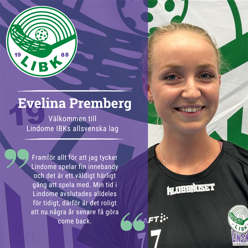 Lindome IBKs allsvenska lag har en lite sen silly att dela med sig av. Vi kan idag presentera ett nyförvärv till vår allsvenska trupp. Det är forwarden Evelina Premberg som nu valt att ansluta till Lindome IBK. Tränare Mathias Bernvid kommenterar nyförvärvet: "Kul att vi fått in Evelina, en spelare med speed och ett rörelsemönster som gör det svårt för motståndarna. Evelina har tränat med oss de senaste veckorna och känns gjuten in i gruppen och de skall bli spännande att se henne i år i den gröna tröjan." Du har ju sedan tidigare varit i Lindome en sejour och nu är du tillbaka! Vad fick dig att skriva på? "Framför allt för att jag tycker Lindome spelar fin innebandy och det är ett väldigt härligt gäng att spela med. Min tid i Lindome avslutades alldeles för tidigt, därför är det roligt att nu några år senare få göra come back." Du har hunnit med en träningsmatch och seriepremiären, vilken känsla har du fått? Vad tycker du är lagets styrkor? "Jag tycker seriepremiären talade väldigt mycket för att det kommer bli en spännande säsong. Vi har ett starkt lag med grym vilja. Vi har ett sammansvetsat lag vilket jag tycker är lagets största styrka." Vilka styrkor kommer du att tillföra gruppen tror du? "Positiv energi och mycket spring." Din personliga målsättning med nästa/kommande säsong? "Det är väl främst att hitta min plats i laget och utvecklas inom det jag är både bra och mindre bra på." Vilket är ditt roligaste innebandyminne fram tills nu? "Jag har ju spelat ett antal cuper och matcher under mina år, men skulle nog säga cuperna i Prag jag spelat som yngre varit svåra att slå upplevelsemässigt." Vad gör du när du inte spelar och tränar innebandy? "Förutom att jobba, umgås med vänner och pojkvän försöker jag även lägga min tid på alla mina andra intressen som cykling, tennis, vara ute i naturen osv." Vad gör du helst en ledig dag? "Jag tar i princip varje tillfälle jag får för att resa och upptäcka nytt, men tar helst mer än en dag ledigt i sådana fall." Vad väljer du? En tunnel på en spelare och sedan ett fint mål eller en klockren pass från lagkamraten och mål? "Skulle nog egentligen vilja säga att det är roligaste att slå den klockrena passen själv, men om jag måste välja mellan alternativen som ges skulle jag säga en klockren pass från lagkamraten och mål." Skottäck eller mål? "Skulle vilja säga båda, men säger mål eftersom känslan oftast vara längst! Haha" Bästa förberedelserna innan match? "En god frukost/brunch med bra musik i högtalarna." Tack Evelina och varmt välkommen!