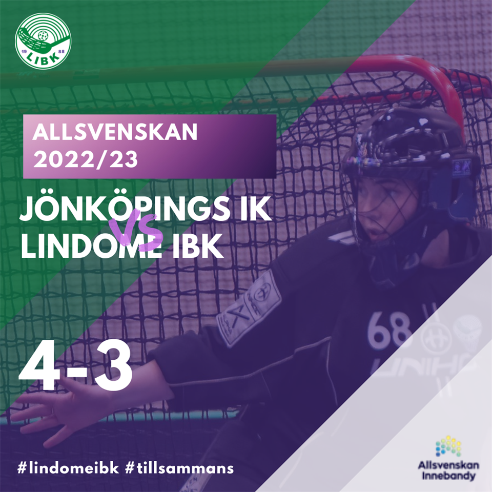 Matchreferat: Jönköpings IK - Lindome IBK (allsv), 20 november 16:00, Arenan Jönköpings Idrottshus Första perioden spelar vi precis enligt plan, Jönköping har svårt att komma åt oss och vi spelar ur deras press, vi leder rättvist med tre noll. Andra och tredje perioden så tappar vi tyvärr allt de vi gjort bra i första och tar sämre beslut. Jönköping kommer in med ny energi och vi ger dom tyvärr för lätta lägen. Så 3-3 efter fulltid är rättvist. Det som utmanade oss en del i matchen var att Jönköping stundtals hade en bra press, många gånger löser vi den, men många gånger så gör vi de för svårt och följer inte de vi pratat om. Jönköping har ett högt tempo och spelar fysiskt, någonting som brukar passa oss bra, men denna match når vi inte upp i den nivån som vi kan ligga på. Vad som är kul att ta med sig är att vi gör mål i powerplay igen, och håller nollan i boxplay, två delar som vi fortsätter att göra bra. Nu i veckan som kommer ska vi förbereda oss för matchen mot Lindås, ta med oss de som var bra och dåligt i denna match och jobba vidare med mot helgen. Matchens stjärnor: ⭐⭐⭐ Wilma Holmberg ⭐⭐ Emilia Lööv Miljevic ⭐ Emilia Jansson /Mathias Bernvid, tränare Lindome IBK Slutresultat: Jönköpings IK - Lindome IBK 4-3 e.f. (0-3, 1-0, 2-0, 1-0) Som matchens lirare utsågs #11 Amanda Lööv Miljevic i Lindome IBK av Jönköping IKs organisation.