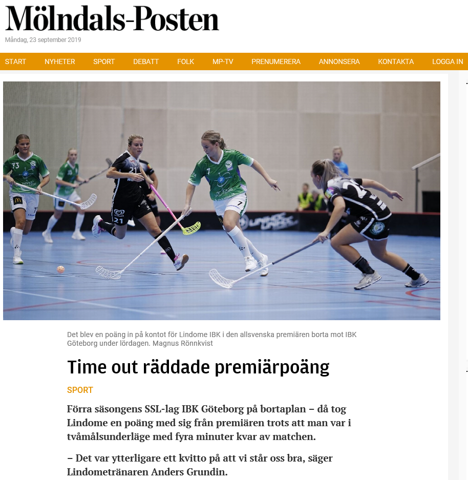 I säsongspremiären i lördags tog Lindome IBK ett poäng mot fjolårets SSL-lag IBK Göteborg. Slutresultat blev 3-2 till IBK Göteborg efter förlängning. Målgörarna för Lindome IBK var Louise Hedkvist och Linnea Gustavsson, båda med assist av Jonna Karlsson. Stort grattis till hela laget !! Mölndals-Posten var på plats, så läs hela artikeln i Mölndals-Posten för dig som är prenumerant. Dam A-lag 23 sep 2019 0kommentarer