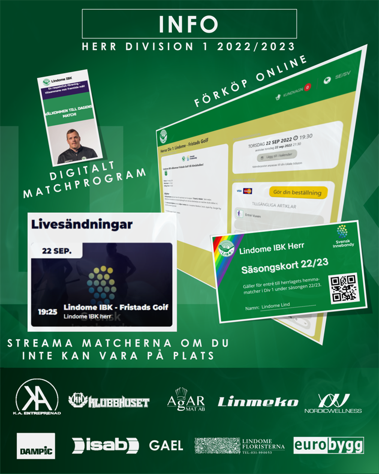 Biljetter Förköpsbiljetter sĂ€ljs via denna lĂ€nk och via appen "TicketCo Wallet" fram till matchstart . Ev. resterande biljetter kommer sĂ€ljas i entrĂ©n dĂ€r vi accepterar Betalkort, Swish, Apple Pay, Google Pay med flera betalningsmedel. SĂ€songskortet gĂ€ller för entrĂ© till alla herrlagets hemmamatcher i Div 1 under sĂ€songen 22/23. Med ett sĂ€songskort har du alltid en reserverad biljett, du behöver inte boka nya biljetter till varje match. Visa ditt sĂ€songskort i entrĂ©n för att komma in snabbt och smidigt. SĂ„ passa nu pĂ„ att fĂ„ lite mĂ€ngdrabatt och stötta samtidigt vĂ„ra grymma killar đđđ LivesĂ€ndning Har du inte möjlighet att vara pĂ„ plats kan du alltid streama matchen pĂ„ Innebandy.tv Köp abonnemang och stötta föreningen med 40 kr vi denna lĂ€nk. Du fĂ„r Ă€ven tillgĂ„ng till alla livesĂ€ndningar och videoklipp frĂ„n Svenska Cupen, landskamper pĂ„ InnebandyTV, Damernas allsvenska, samt allt innehĂ„ll kategoriserat pĂ„ Ăvrigt. För 99 kr i mĂ„naden, helt utan bindningstid, abonnerar du pĂ„ allt innehĂ„ll. Det gĂ„r Ă€ven att köpa matcherna som PPV, Ă€ven detta stöttar LIBK. LĂ€nk till matcherna hittar du hĂ€r Matcharrangemangen kommer förhoppningsvis förgylla i periodpauserna med tĂ€vlingar och underhĂ„llande knattematcher, det kommer finnas ett digitalt matchprogram med "inför matchen intervjuer" och möjligheten att rösta pĂ„ matchens lirare m.m.. Kom ner och fyll hallen pĂ„ torsdag i hemmapermiĂ€ren.