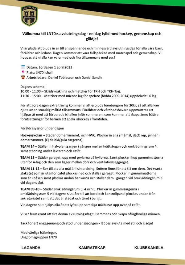 Klicka på bekräftelselänken i det mejl vi skickat dig för att börja ta emot uppdateringar från Lödöse-Nygård 70 HC Hockeyskola.