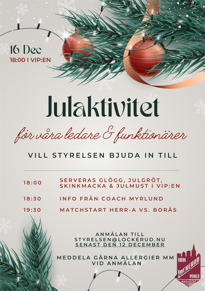Styrelsen önskar bjuda in våra funktionärer och ledare till julgröt, coachsnack och match. När: 16 december 18.00 Var: VIPen För vem: Ledare och funktionärer Anmäl senast den 12 december till styrelsen@lockerud.nu Väl mött!