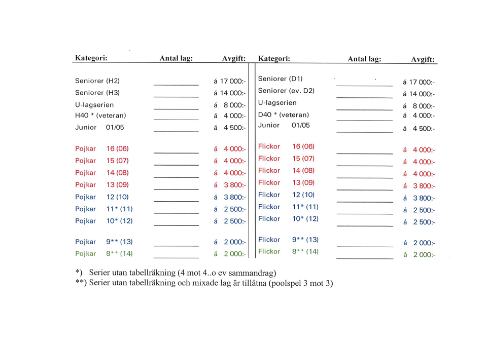 Så var det dags att anmäla lag till nästa års serier! Vår tanke är att vi anmäler likt förra året, men om det är något lag som vill spela i annan serie så måste ni höra av er snarast. Det är extra viktigt att F07/08 samt P13/14 hör av sig så att vi kan titta på en bra lösning för er. Senast den 18 maj 2022 måste vi skicka in ansökan, så ju förr ju bättre. Hör av er till Elin på 070-265 70 58 eller Mathias på 070-227 51 60.