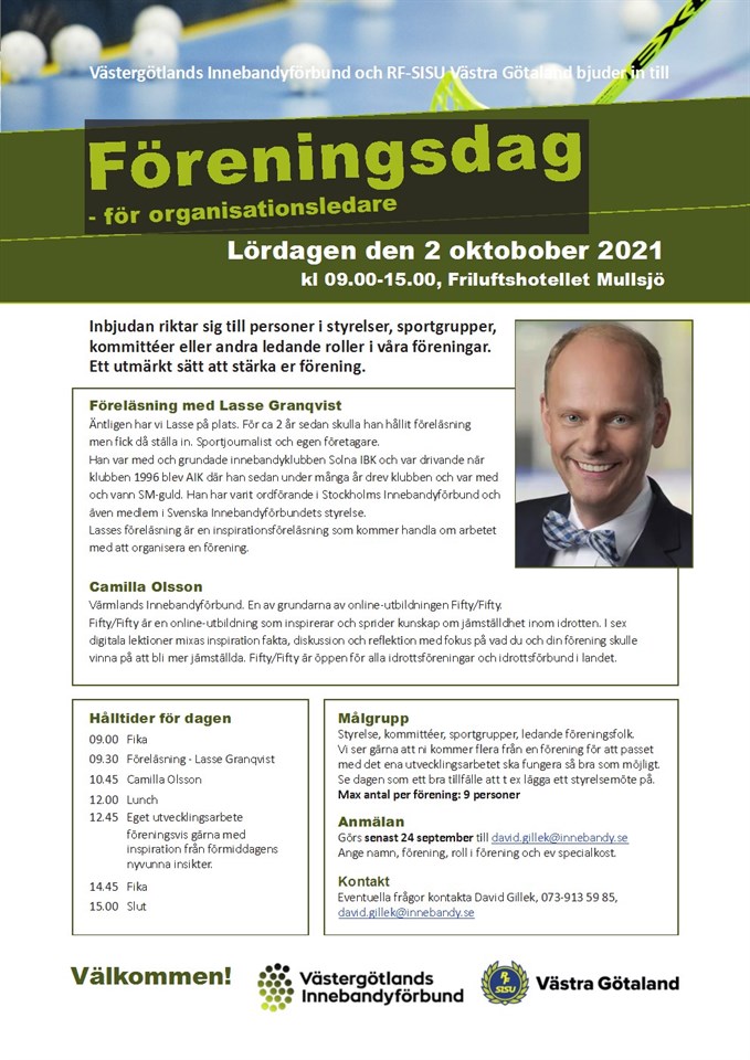 Hej, Nu bjuder vi en till en föreningsdag för organisationsledare där vi äntligen kommer ha tv och radioprofilen Lasse Granqvist på plats för att föreläsa och inspirera. Dagen innehåller även en föreläsning med Camilla Olsson som varit med och grundat den aktuella online-utbildningen Fifty/Fifty. På eftermiddagen blir det tid för eget utvecklingsarbete föreningsvis. Inbjudan riktar sig till personer i styrelser, sportgrupper, kommittéer eller andra ledande roller i våra föreningar. Se dagen som ett bra tillfälle att t ex lägga ett styrelsemöte på. Det är av stor vikt att mottagare av denna inbjudan via mail vidarebefordrar den till alla som tillhör målgruppen för föreningsdagen. Bifogar inbjudan. Med vänlig hälsning David Gillek Utvecklingskonsulent 073-9135985 david.gillek@innebandy.se Ledarsidan 30 aug 2021 0kommentarer