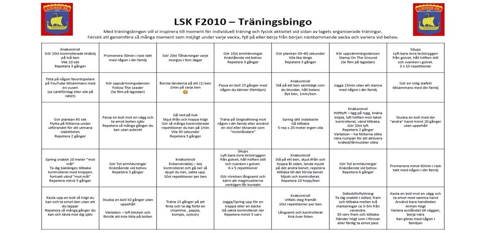 Håll i, Håll ut, HÅLL IGÅNG. Hej bästa laget! Som ni vet så fortsätter Covid-pandemin och även om vaccineringar har påbörjats är det långt kvar till en normal tillvaro. Situationen i Stockholm är sådan att alla möjligheter att begränsa pandemins spridning måste vidtas. Stockholms Handbollsförbund har gått ut med tydliga instruktioner om att ingen organiserad träningsverksamhet får genomföras. Det gäller både inom- som utomhus och samtliga åldersgrupper. LSK följer givetvis dessa instruktioner. I nuläget gäller detta fram till den 24 januari, men det kan komma att förlängas. Det innebär att första träningstillfället efter Juluppehållet skjuts fram tillsvidare. Träningstiderna 16/1 och 23/1 är inställda. Träningsbingo Vi ledare vill på alla sätt uppmuntra och inspirera till individuell träning. Det är viktigt att hålla igång även om vi i nuläget inte kan genomföra organiserad träning tillsammans. Vi har därför sammanställt ett Träningsbingo som syftar till att peppa och inspirera till aktiviteter som ni kan göra tillsammans i familjen med moment både för styrka och nyttig pulshöjning utöver att hålla igång tekniken och passningar. LSK F2010 Träningsbingo - länk till dokument Som komplement till Träningsbingon kan det vara bra att kika igenom följande sida på temat Knäkontroll. Den är visserligen utformad kring fotbollsspelare, men är minst lika relevant för oss Handbollsspelare. SISU Idrottsböcker - Knäkontroll - länk Ni får gärna dela med er av foton när ni kämpar tillsammans i familjerna. Peppa varandra via laget.se, så håller vi igång lagsammanhållningen fast på distans. Inspiration och förebilder Utöver alla träningsmoment i Träningsbingon så vill vi även slå emellan med möjlighet att titta på riktigt bra handbollsspelare. Vi har sammanställt en länksamling till klipp på YouTube där vi lyfter fram spelare på alla typer av positioner, från Målvakten vidare till mitt- och kantspelare. Vi lägger ut länksamlingen som en separat nyhet. Varma hälsningar Matilda, Elsa, Peter, Kristoffer, Johan