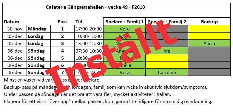 Uppdatering 2020-11-19: Restriktionerna förlängs, cafeterian fortsatt stängd. Vårt lags ansvar vecka 49 utgår och är inställt. Uppdatering 2020-10-30: Med anleding av nya riktlinjer utifrån utvecklingen av Covid-19 pandemin. Vi avvaktar besked om Cafeterian kommer att återöppnas efter 19 november och i så fall hur vår planering för bemanning påverkas. ********* Äntligen kan vi hålla Cafeterian i Gångsätrahallen öppen och vårt lag har fått ansvaret under vecka 49. Passen vi behöver bemanna framgår i nyhetsbilden. Vänligen svara med kommentar nedan innehållandes spelarens namn samt siffra på ledigt pass. Först till kvarn. För er som är nya, vi som varit med förut stöttar och välj gärna ett pass där vi bemannar från två familjer. Teamwork! 😊