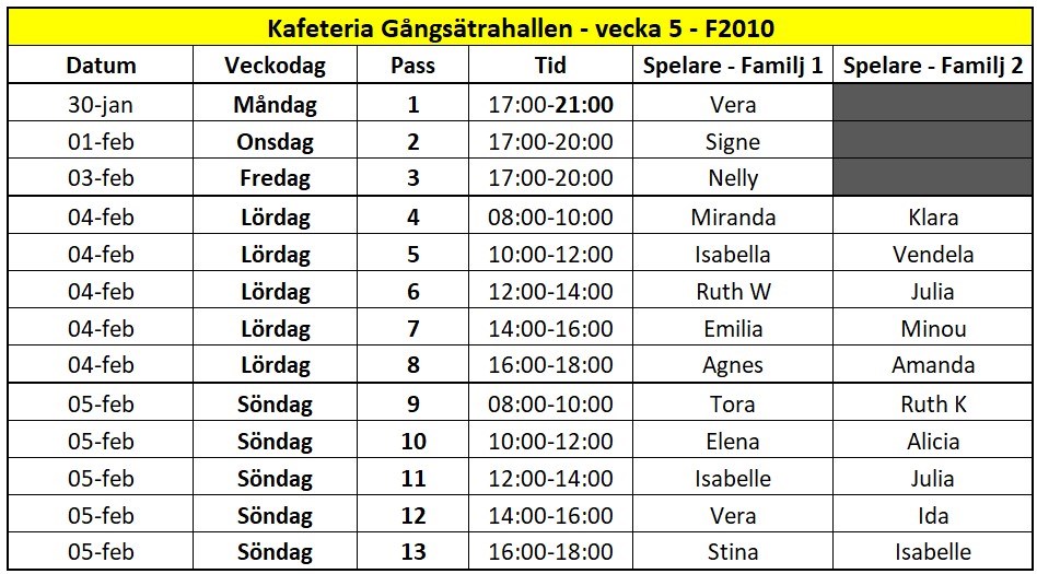 Vecka 5 ansvarar vårt lag för bemanning av klubbens kafeteria i Gångsätrahallen. Precis som tidigare behövs hjälp av samtliga spelarfamiljer för att fördela ansvaret så rättvist som möjligt. Spelare/familj har tilldelats arbetspass enligt nedan lista, se även bilden till artikeln. Vid behov av byte, ansvarar varje familj för att ordna bytet efter avstämning med övriga spelarfamiljer i laget. Meddela i kommentarsfältet vilka som eventuellt byter med varandra så håller vi schemat uppdaterat i denna artikel. Kafeteriaveckan innebär även en intäkt till lagkassan med 2.000kr. Under höstens kafeteriavecka noterade vårt lag näst högst omsättning av alla lag. Totalt 14.400kr omsattes under vår vecka och snittinköpet den månaden var 40kr/kund, troligen högre under vår vecka. Det ska vi bräcka! Fantastiska bakverk levererades från duktiga familjer. Baka gärna till lördagen och söndagen även denna gång, det var mycket uppskattat och ryktet spred sig i höstas. Vi får mycket uppskattning från klubben och gäster i hallen. Toppen! Om spelare deltar i egna matcher på söndagen förväntas endast förälder och eventuella syskon bemanna kafeterian. Måndag 30 januari, klockan 17:00-21:00 – Vera Onsdag 1 februari, klockan 17:00-20:00 – Signe Fredag 3 februari, klockan 17:00-20:00 – Nelly Lördag 4 februari, klockan 08:00-10:00 – Miranda och Klara Lördag 4 februari, klockan 10:00-12:00 – Isabella och Vendela Lördag 4 februari, klockan 12:00-14:00 – Ruth Wicknertz och Julia Lördag 4 februari, klockan 14:00-16:00 – Emilia och Minou Lördag 4 februari, klockan 16:00-18:00 – Agnes och Amanda Söndag 5 februari, klockan 08:00-10:00 – Tora och Ruth Karlsson Söndag 5 februari, klockan 10:00-12:00 – Elena och Alicia Söndag 5 februari, klockan 12:00-14:00 – Isabelle och Julia (extra pass) Söndag 5 februari, klockan 14:00-16:00 – Vera och Ida Söndag 5 februari, klockan 16:00-18:00 – Stina och Isabelle (extra pass) Instruktioner, tips och råd mailas ut närmare inpå kafeteriaveckan. Ni som varit med förut vet hur kul det är och vilken stämning det brukar vara i hallen. Minst en (1) vuxen vid varje pass måndag, onsdag, fredag. Oftast låg aktivitet. Två (2) familjer varje pass på lördag och söndag. Mycket aktivitet och publik fram till ca 17-tiden väntas. Måndag: Dam B-lagsmatch med start 20:30. Förlängd öppettid fram till ca 21:00. Lördag: Dam A-lagsmatch med start 14:00. Matcher i hallen hela dagen. Söndag: Våra egna seriematcher förmiddag. Dam B-lagsmatch 14:30 i LSK-hallen. Bollskoj i Gångsätra på eftermiddagen fram till 17:00. Sista passet lördag och söndag stänger ner och städar även av läktaren samt tömmer sopsäckar. Aktiviteten brukar minska rejält vid 17-tiden då det går att börja städa av. Vi håller öppet i kafeterian minst till klockan 17:30 lördag och söndag. Notera att vid egna seriematcher söndag förmiddag behövs EMP-utbildade till sekretariatet, övriga som kan hjälpa till vid matcherna behövs för filmning SolidSport/LSK-TV. Vi fortsätter hålla flaggan högt! Hälsningar Ledarteamet LSK F2010 Johan Lottie Peter Sofia Kristoffer Mathilda