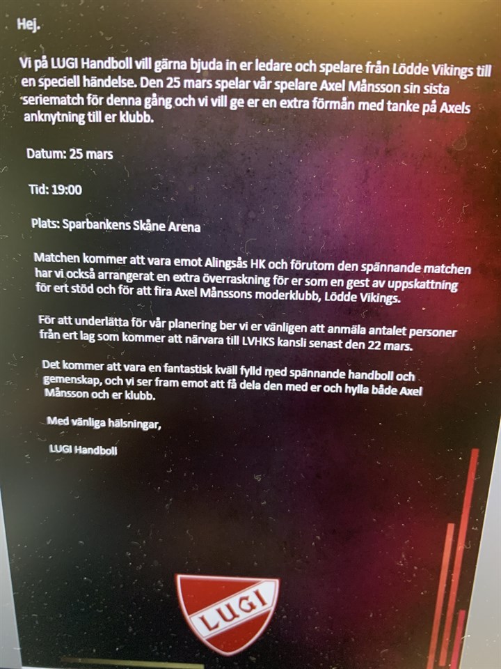 LVHK har blivit inbjudna till att komma och heja fram Lugi mot Alingsås i herrligan 25/3 kl 19:00. Då spelar Axel Månsson (fostrad i LVHK) sin sista match i Lugitröjan innan han ger sig av mot Kristianstad.