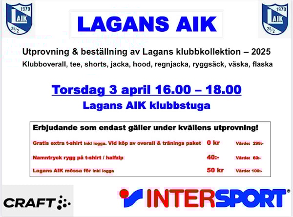 Intersport kommer till LAIK-lokalen för utprovning av kläder. Se bild för mer information om erbjudande!