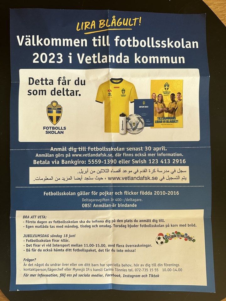 Glöm inte att anmäla dig till årets fotbollsskola som LIF anordnar vecka 25 på Borovallen. Sista anmälningsdag söndag 30/4. OBOS erbjuder sina medlemmar rabatt på 200 kr på anmälningsavgiften. Majblomman erbjuder stöd för de som behöver få hjälp med avgiften för fotbollsskolan. Se info på hemsidan. http://vetlandafsk.se/ Frågor? Kontakta Maja Klerelid 076-1470417 F-12 (2013-2014) 25 apr 2023 0kommentarer