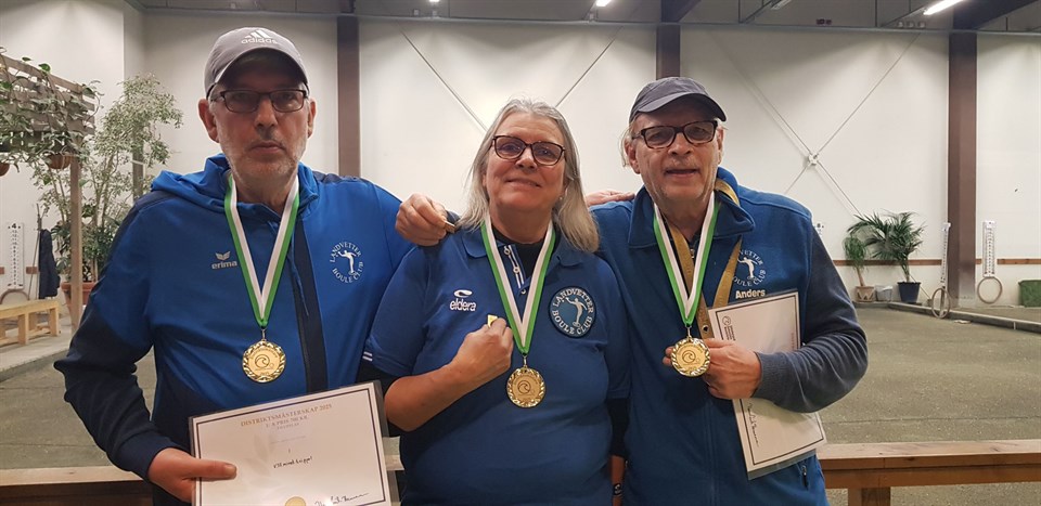 I lördagens DM i mixed trippel i V55-klassen stog vårt lag med Anders, Besim och Eva-Karin som guldmedaljörer. Grattis till årets första DM-medalj för LAN. Klicka HÄR för resultatlistan med de 8 bästa lagen. I öppen klass tävlade Annelie, Elias och Andreas J. De kom på en delad 5:e plats. Resultatlistan med de 8 främsta lagen finns här. På söndagen var det dags för V65-klassen där 3 lag kom till start. Lasse L, Pia D och Roger bildade ett lag och Jonny, Pia A och Ann var ett lag medan ett tredje lag bestod av Hans H, Katarina och Anita J. Alla lagen kämpade hårt men inget av lagen tog sig till slutspel. De skall nu hem och träna hårdare inför nästa tävling.