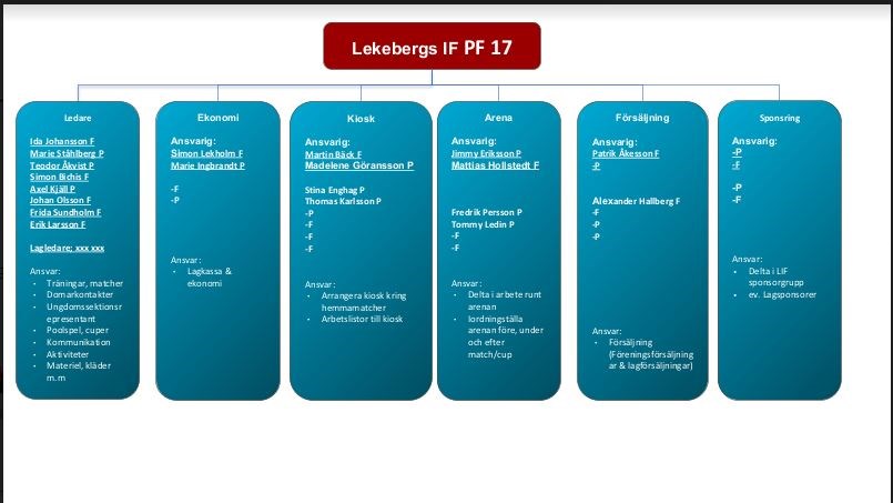 - Vi behöver hjälp från er föräldrar att stötta upp organisationen kring laget. Alla föräldrar behöver engageras i någon roll för att skapa delaktighet och engagemang samt för att säkerställa att vi kan hålla igång verksamheten på sikt. Vi behöver ha följande funktioner/ansvarsområden: Lagledare, ekonomi (kassör), kioskansvar, försäljningsansvar, arenaansvar, samt sponsring. Av bifogad bild kan ni se hur fördelningen ser ut just nu bland de föräldrar som hittills anmält sig samt en kortfattad beskrivning av vad varje område innebär. De föräldrar som ännu inte har skrivit upp sig på ett ansvarsområde kan meddela oss antingen här via laget.se eller höra av sig till Theodor om vilken roll man känner störst sug för att ta sig an. Vi siktar på att ha rollfördelningen klar i början av oktober så hör gärna av er senast 2023-09-30. De områden där vi gärna ser många föräldrar är kiosk-, försäljning-, och arenaansvaret. Ju fler vi är som kan dela på dessa arbetsuppgifter desto bättre.