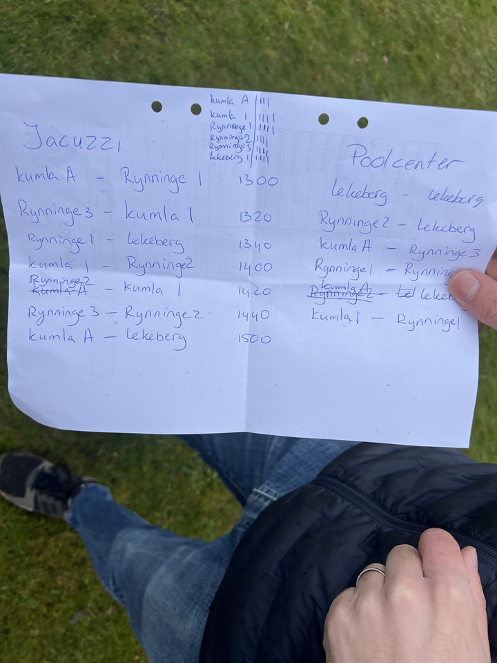 Hello, Rynninge IK har bjudit in till matchspel. Vi har anmält två lag, varje lag kommer spela totalt tre matcher. Se spelschema i bilden. Matcherna är 4x3min. Anmälan har skickats ut, svara gärna om ert barn kan deltaga. Samling kl 11:20 på Pettersbergs IP söndagen den 26/5. Ha det gott!