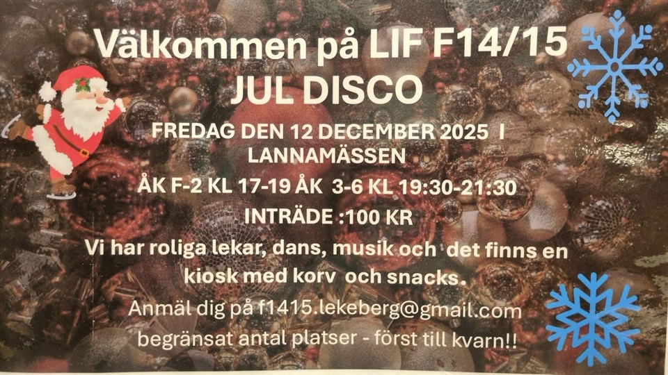 Passa på att säkra er plats på juldiscot 12 december i Lanna mässen som anordnas av F14/15. Det finns fortfarande några fåtal platser kvar för årskurs 3-6!