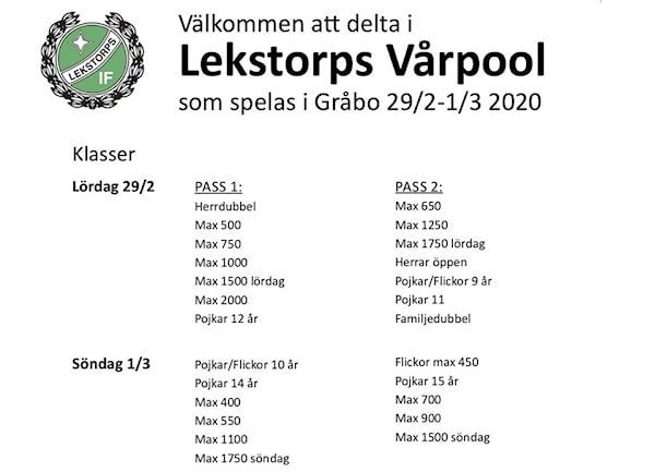 Inbjudan till Lekstorps Vårpool som spelas i hjällsnäshallen 29 februari-1 mars är nu klar. Anmälan senast 15 Februari. FInns klasser som passar för både nybörjare och elit. Se inbjudan för mer information. Sprid gärna denna info vidare :)
