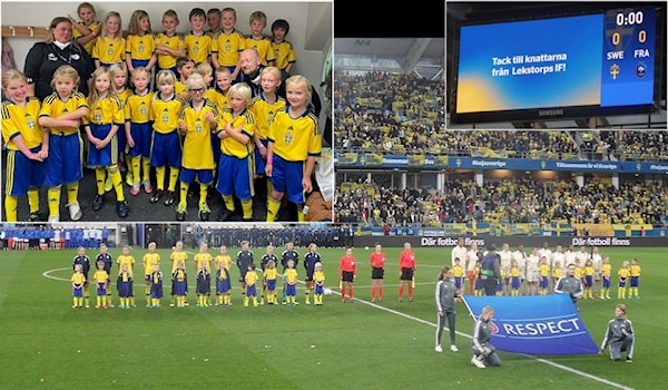 Under några minuter på planen fick barnen stå tillsammans med stjärnorna i landslagen och lyssna till nationalsångerna. Landslagstjerna lånade snällt ut sina överdragskläder till de killar och tjejer som frös. Efteråt sprang barnen tillbaka till omklädningsrummen för att sedan byta om och vara med på läktaren och heja fram Sverige i matchen.