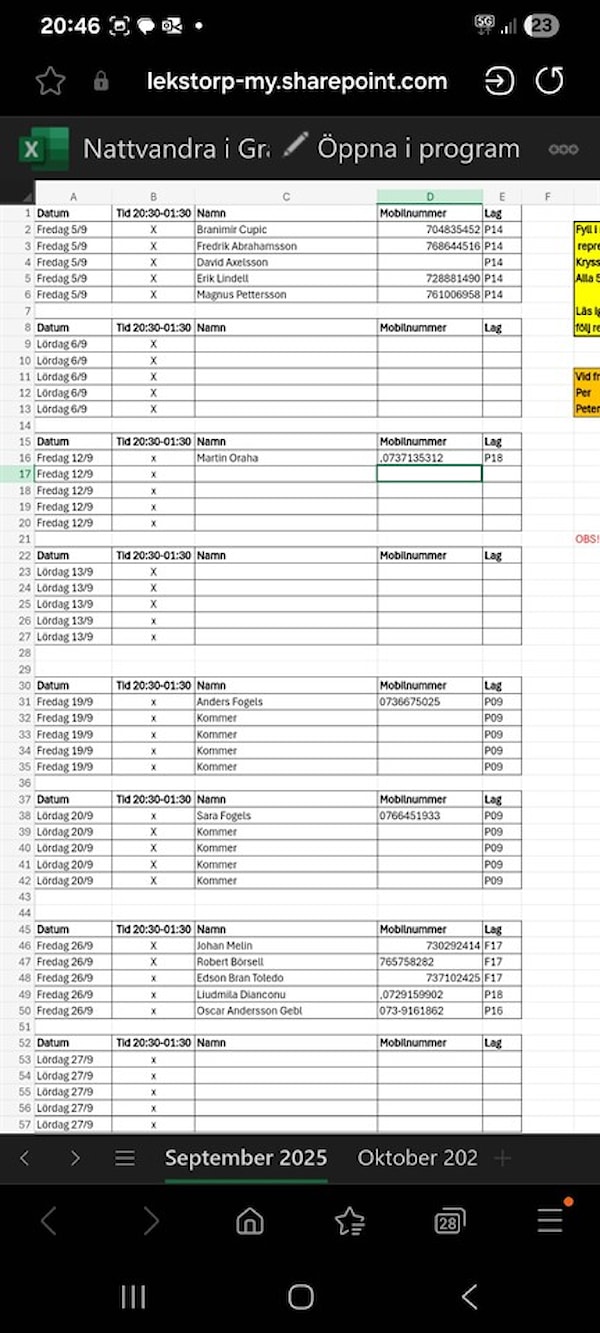 Då är ni uppsatta 20.30-01.30 den 24/10. Christian, du har koll på allt som gäller eller?