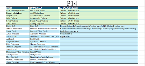 Jag har bifogat schema över vilka barn som tillhör P14 och hur fördelning av ansvarsområden är i dagsläget. Ni hittar kontaktuppgifter till varandra i lagetappen under kontaktbok.