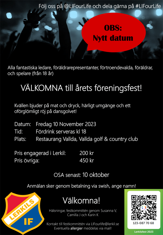 Vi har tyvärr blivit tvugna att skjuta på vår planerade föreningsfest. Dock är nytt datum redan bokat så vi hälsar er alla välkomna till Vallda Golf restaurang den 10 november. Vi hoppas att alla ni som redan har betalat in fortfarande kan komma, annars får ni hör av er till lifourlife@lerkilsif.se. Det finns platser kvar så förhoppningsvis är vi fler som har möjlighet att komma när fotbollssäsongens går in i en mer lugn period. Anmälan är fortsatt öppen! Varmt välkomna! // Festkommitttén F-2014 8 sep 2023 0kommentarer