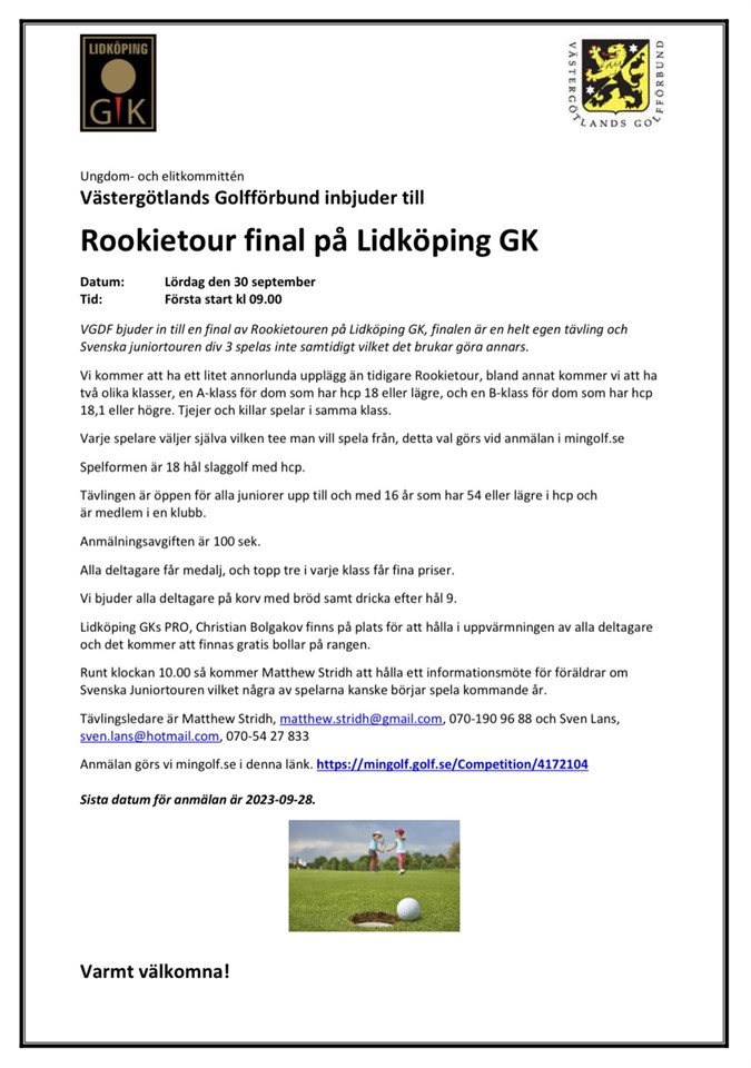 Passa på! Sista Rookie Touren för säsongen spelas på vår hemmabana Lidköpings GK. VGDF bjuder in till en final av Rookietouren. För mer info se bifogad inbjudan. In och anmäl er! Anmälan Rookie Tour Final Grupp Röd 20 sep 2023 0kommentarer