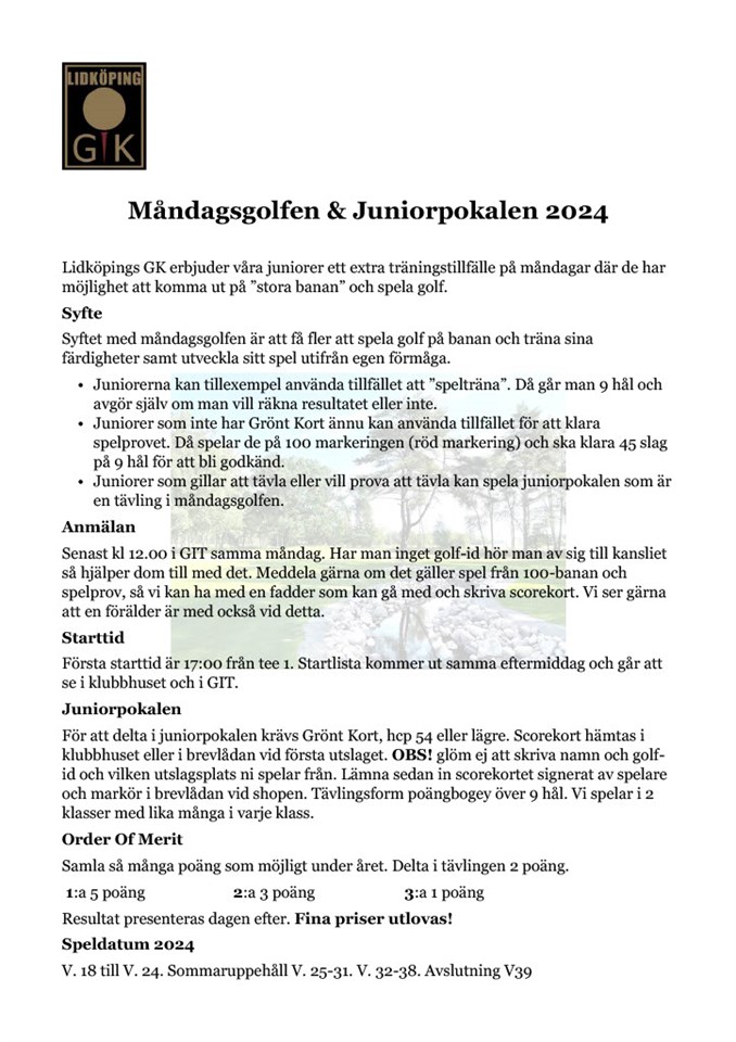Hej, På måndag 29/4 klockan 17:00 startar JP & Måndagsgolfen. In och anmäl er i GIT. Se länk: Anmälan JP & Måndagsgolfen Har ni inget golf-ID så kontakta kansliet så ordnar de det åt er. För mer info, se bifogat dokument. Mvh Juniorkommittén