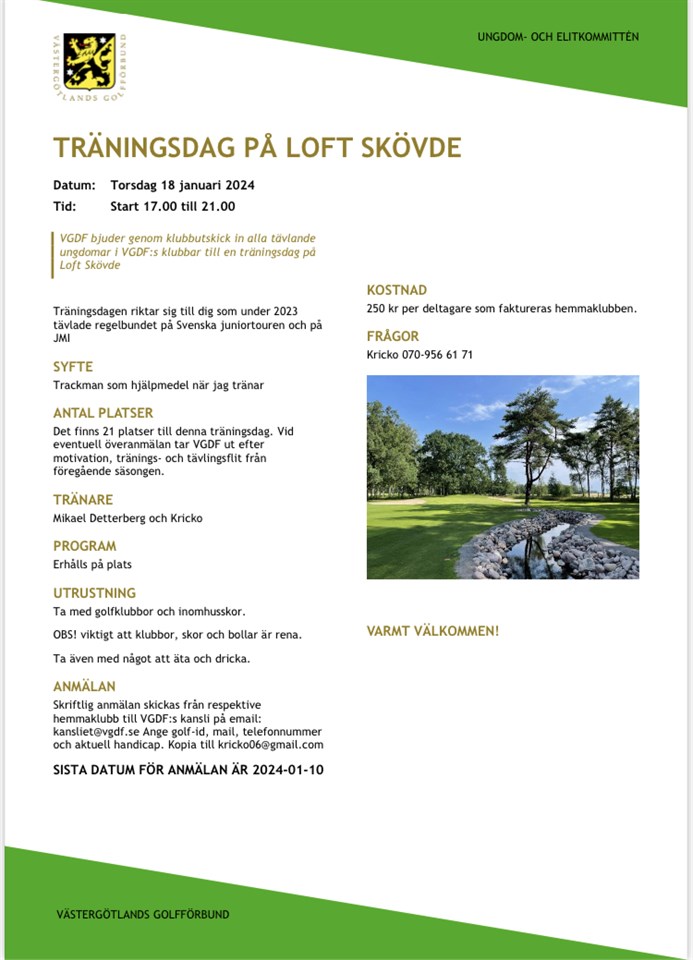 Hej, Anmäl er till träningsdag på Loft i Skövde. Datum: Torsdag 18 januari 2024 Tid: Start 17.00 till 21.00 Träningsdagen riktar sig till dig som under 2023 tävlade regelbundet på Svenska juniortouren och på JMI SYFTE Trackman som hjälpmedel när jag tränar TRÄNARE Mikael Detterberg och Kricko PROGRAM Erhålls på plats UTRUSTNING Ta med golfklubbor och inomhusskor. OBS! viktigt att klubbor, skor och bollar är rena. Ta även med något att äta och dricka. ANMÄLAN Anmäl er via Christian Bolgakov pro@lidkopingsgk.se SISTA DATUM FÖR ANMÄLAN ÄR 2024-01-10 Med vänlig hälsning, Juniorkommitten Grupp Grön 18 dec 2023 0kommentarer