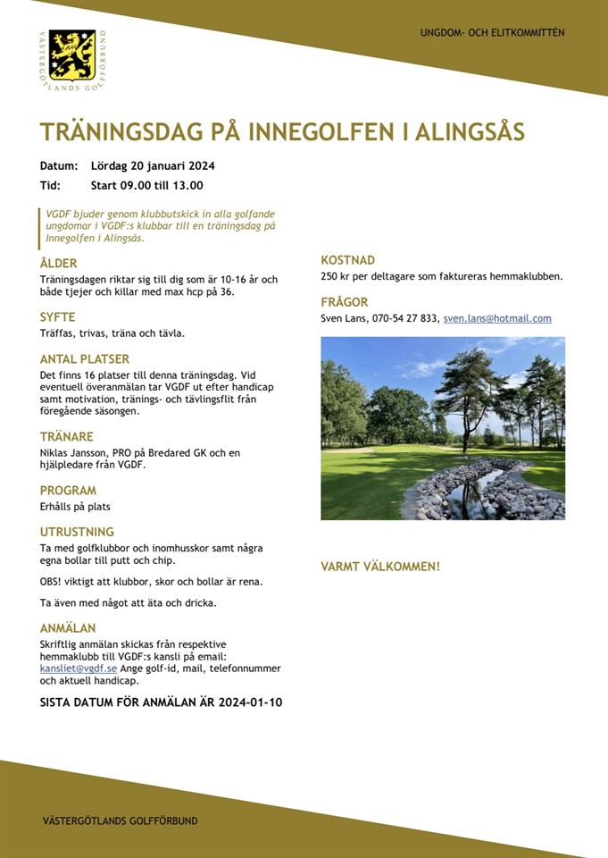 Hej, VGDF bjuder in alla golfande ungdomar i VGDF:s klubbar till en träningsdag på Innegolfen i Alingsås. Datum: Lördag 20 januari 2024 Tid: Start 09.00 till 13.00 Träningsdagen riktar sig till dig som är 10-16 år, både tjejer och killar med max hcp på 36. SISTA DATUM FÖR ANMÄLAN ÄR 2024-01-10 För mer information se bifogad inbjudan. Vid frågor kontakta Sven Lans, 070-54 27 833, sven.lans@hotmail.com Hälsningar Juniorkommittén