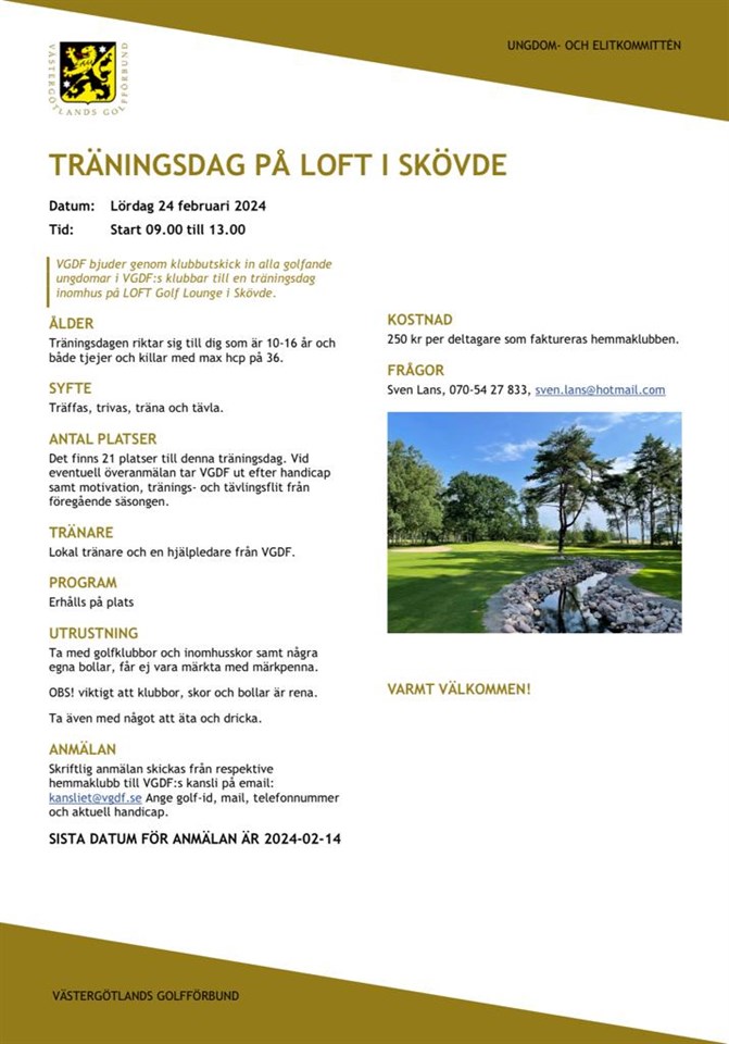 Hej, Nu har årets första månad passerat och vi närmar oss golsäsongen mer och mer. Här kommer en inbjudan från Västergötlands golfförbund som avser en träningsdag på LOFT i Skövde. Ett ypperligt tillfälle att komma igång inför golfsäsongen 2024. Datum: Lördag 24 februari Tid: Start 09:00 till 13:00 Ålder: 10-16 år med max hcp på 36. Syfte: Träffas, trivas, träna och tävla. Anmälan: Skicka anmälan till Christian, pro@lidkopingsgk.se SISTA DATUM FÖR ANMÄLAN ÄR 2024-02-14 Mer information se bifogad bild. Vänlig hälsning Juniorkommittén