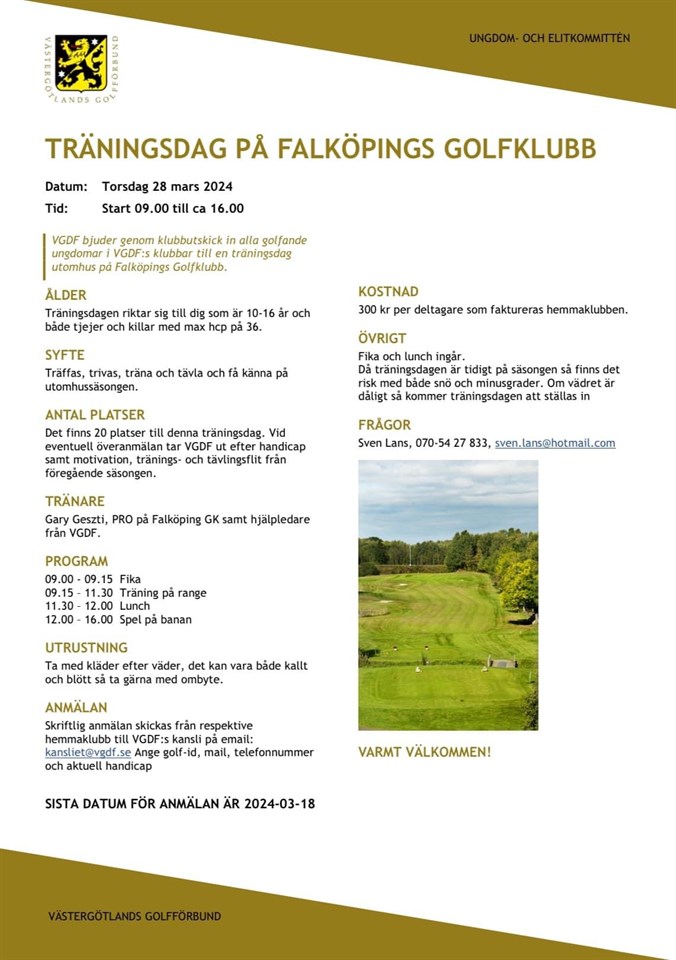 Ny träningsdag bokad! Här kommer en inbjudan från Västergötlands golfförbund som avser en träningsdag utomhus på Falköpings Golfklubb. Ett ypperligt tillfälle att komma igång inför golfsäsongen 2024. Datum: Torsdag 28 mars 2024 (skärtorsdag) Tid: Start 09:00 till ca 16:00 Ålder: 10-16 år med max hcp på 36. Syfte: Träffas, trivas, träna och tävla. Anmälan: Skicka anmälan till Christian, pro@lidkopingsgk.se SISTA DATUM FÖR ANMÄLAN ÄR 2024-03-18 Mer information se bifogad bild. Vänlig hälsning Juniorkommittén
