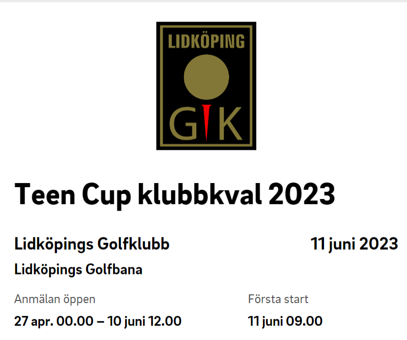 Söndag 11 juni är det dags för klubbkval till Teen Cup . Teen Cup är Sveriges största juniortävling, här har juniorer chansen att gå vidare till gruppkval på Mariestads GK den 1/7 och senare mot Sverigefinal där de 10 bästa killarna och tjejerna möts i varje åldersgrupp. Det är en 18-håls slaggolf- och scratchtävling (kvaltävling) i åldersklasserna 13, 14, 15 och 16 år. Övriga juniorer, yngre eller äldre, kan också delta i tävlingen men utan chans att gå vidare till gruppkval. In och anmäl er via länken nedan. Anmälan Teen Cup // Juniorkommittén
